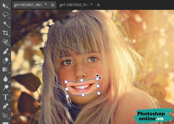 Chọn Move Tool phía bên trái (Hoặc nhấn phím V) ➜ Tiếp đó dùng chuột kéo miệng cười vào vị trí thích hợp.
