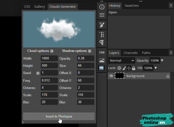 Vì mình chỉ làm ví dụ nên sẽ chèn vào luôn bằng cách bấm nút Insert to Photopea.