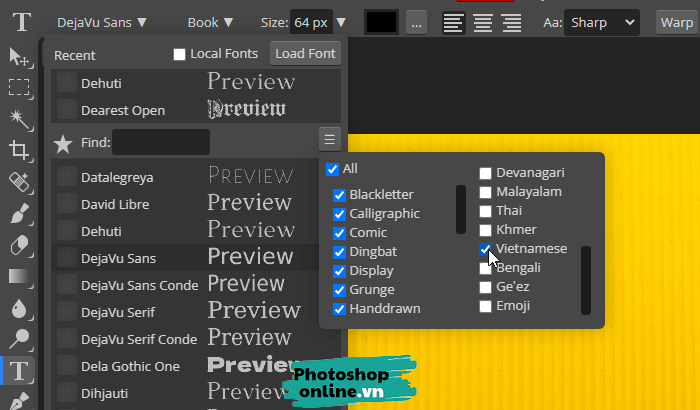 Photoshop online hỗ trợ hàng ngàn font chữ nhưng đa số chỉ hỗ trợ tiếng Anh, vậy nên nhiều lúc gõ tiếng Việt sẽ gặp lỗi, mình sẽ giúp bạn lọc các font chữ tiếng Việt cho bạn.