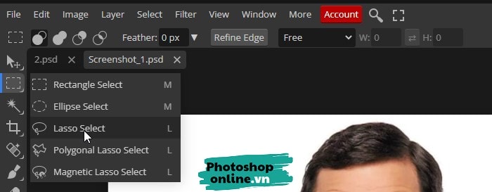 Sau đó nhấp chuột phải vào Rectangle Select chọn Lasso Select.