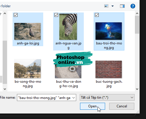 Muốn chọn nhiều ảnh cùng lúc, hãy bấm phím Ctrl đồng thời nhấp chuột vào ảnh ➜ Bấm Open.