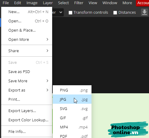 Bước 1: Đầu tiên đến menu chọn File, chọn Export as, sau đó chọn định dạng ảnh cần lưu.