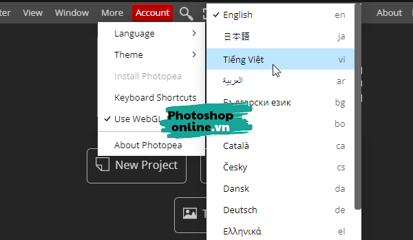 Mặc định Photoshop online bạn đang dùng có giao diện tiếng Anh, tuy nhiên bạn có thể dễ dàng đổi sang ngôn ngữ khác như Tiếng Việt chỉ vài bước đơn giản.